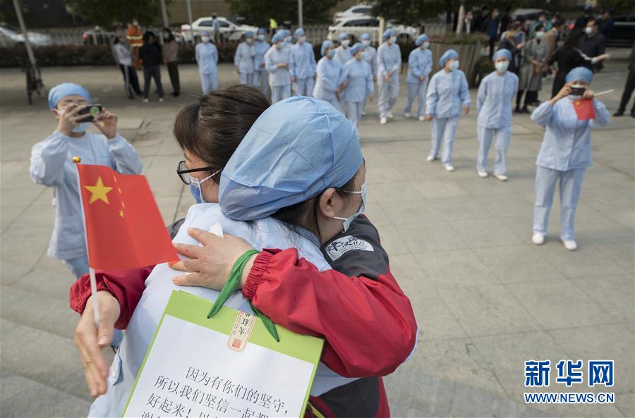 3月21日,武漢市第一醫(yī)院的醫(yī)護人員(前)與天津市醫(yī)療隊隊員李梅擁抱道別。新華社記者費茂華攝