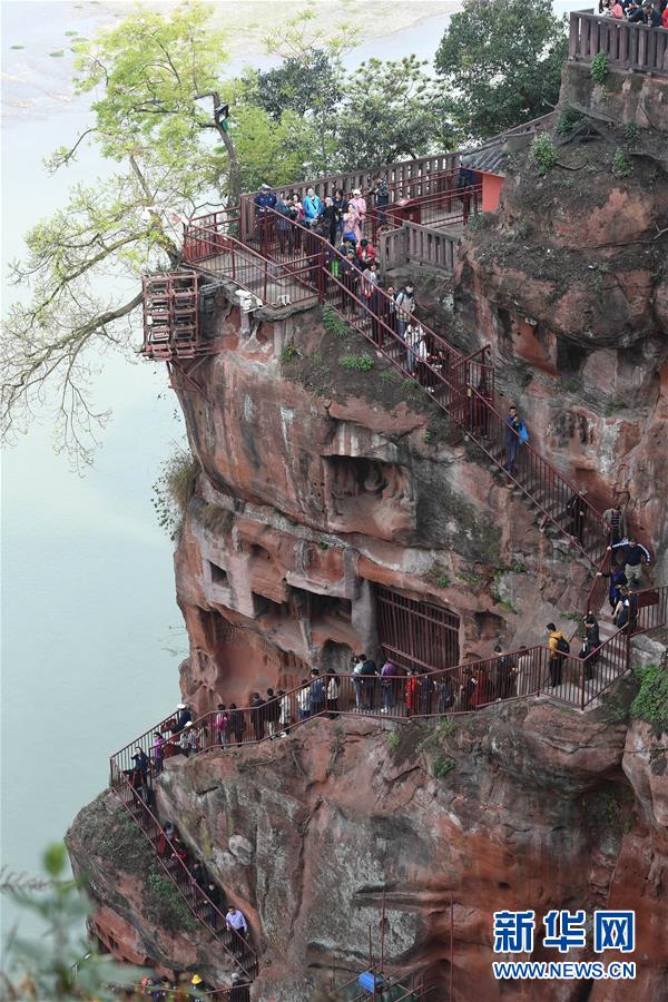 3月23日,游客在樂(lè)山大佛景區(qū)內(nèi)游覽。新華社記者張超群攝