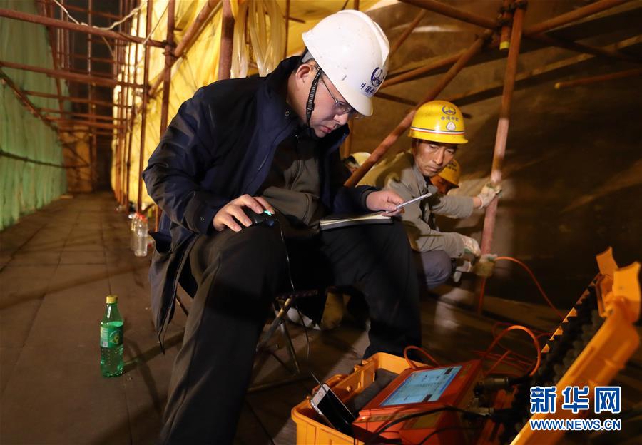 中鐵西北科學(xué)研究院有限公司文保中心的工程師孫博(左)在檢測(cè)探頭的數(shù)據(jù)穩(wěn)定性(3月18日攝)。新華社記者江宏景攝