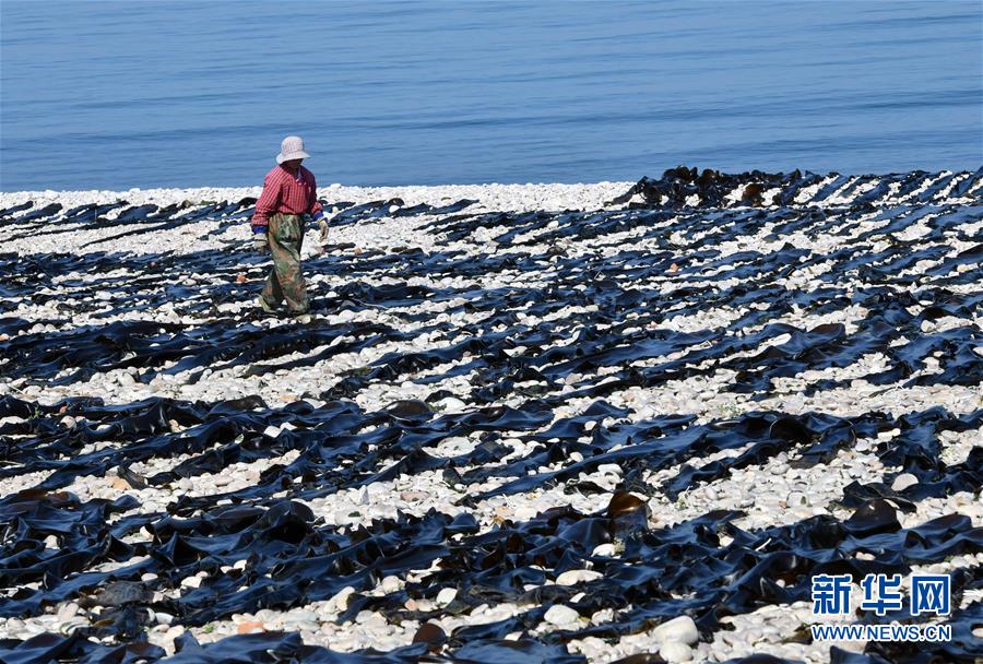海島居民在大欽島鄉(xiāng)東村的海灘上晾曬海帶(5月23日攝)。新華社記者朱崢攝