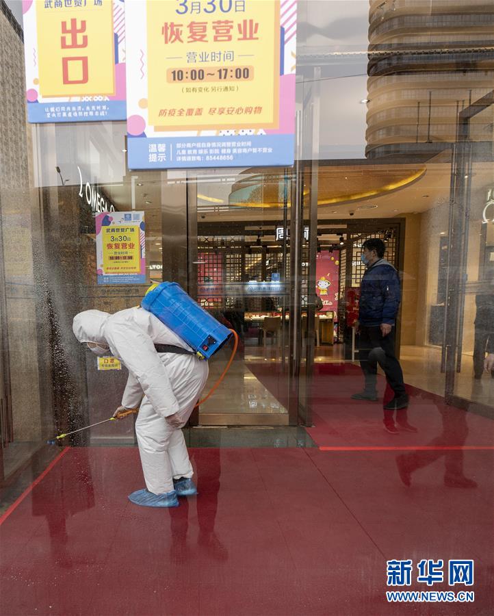 3月30日,在武商世貿(mào)廣場(chǎng),工作人員在開(kāi)門(mén)前進(jìn)行最后的消殺工作。當(dāng)日,武漢市多家商場(chǎng)開(kāi)門(mén)迎客。新華社記者費(fèi)茂華攝