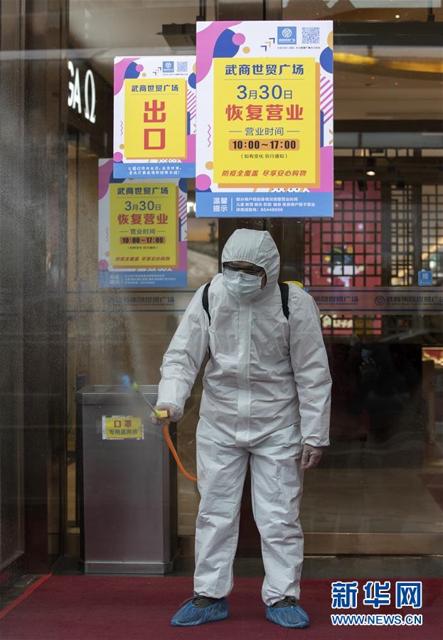 3月30日,在武商世貿(mào)廣場,工作人員在開門前進(jìn)行最后的消殺工作。當(dāng)日,武漢市多家商場開門迎客。新華社記者費(fèi)茂華攝