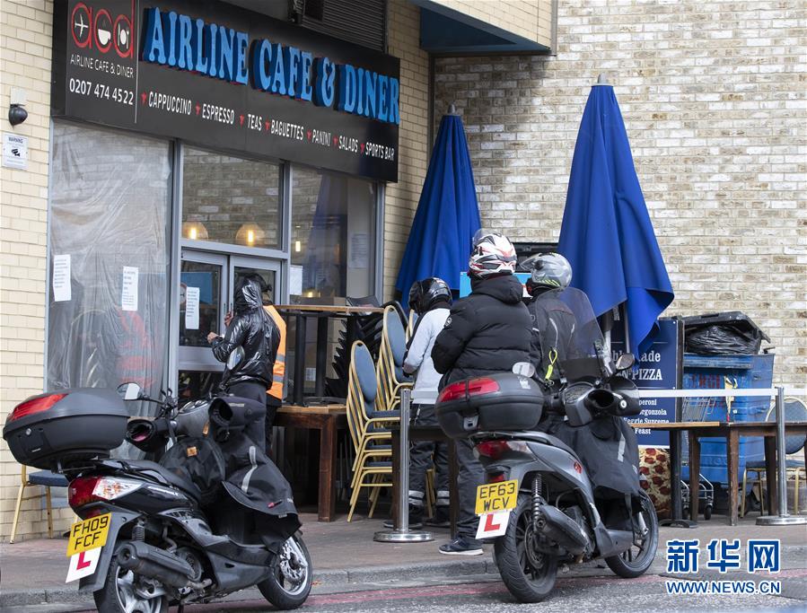 3月30日,在英國(guó)倫敦,幾名外賣(mài)送餐騎手在一家餐廳外等待取餐。英國(guó)衛(wèi)生部30日發(fā)布的數(shù)據(jù)顯示,英國(guó)新冠肺炎確診病例累計(jì)22141例,較前一天增加2619例;累計(jì)死亡病例增至1408例。新華社記者韓巖攝