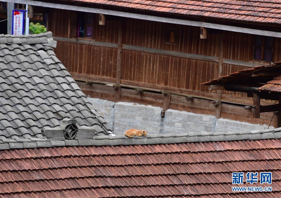 烏英苗寨的一只貓?jiān)谖蓓斔X(9月2日攝)。新華社記者黃孝邦攝