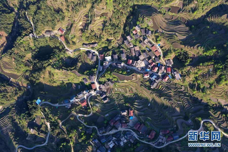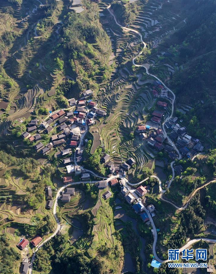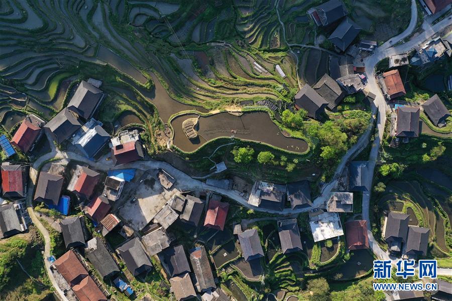 這是融水苗族自治縣桿洞鄉(xiāng)小河村高羽苗寨的木樓和梯田(3月31日攝,無人機(jī)照片)。新華社記者黃孝邦攝