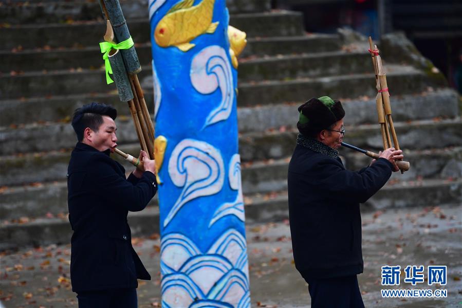 在烏英苗寨新蘆笙柱下,融水苗族自治縣苗族蘆笙音樂代表性傳承人梁安合(右)在練習(xí)吹蘆笙(12月24日攝)。新華社記者王諾攝