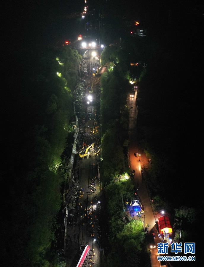3月30日晚,工程機械在京廣鐵路郴州段脫軌事故現(xiàn)場作業(yè)(無人機照片)。新華社記者李尕攝