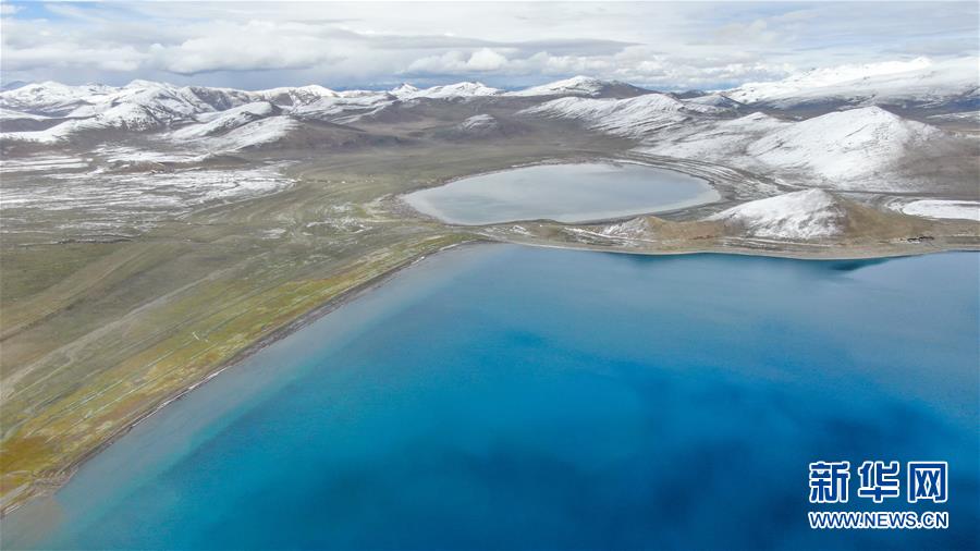 9月24日無人機(jī)拍攝的拿日雍錯。拿日雍錯位于西藏山南市錯那縣北部,海拔4900米,像藍(lán)寶石般鑲嵌在雪山草原之間。新華社記者晉美多吉攝
