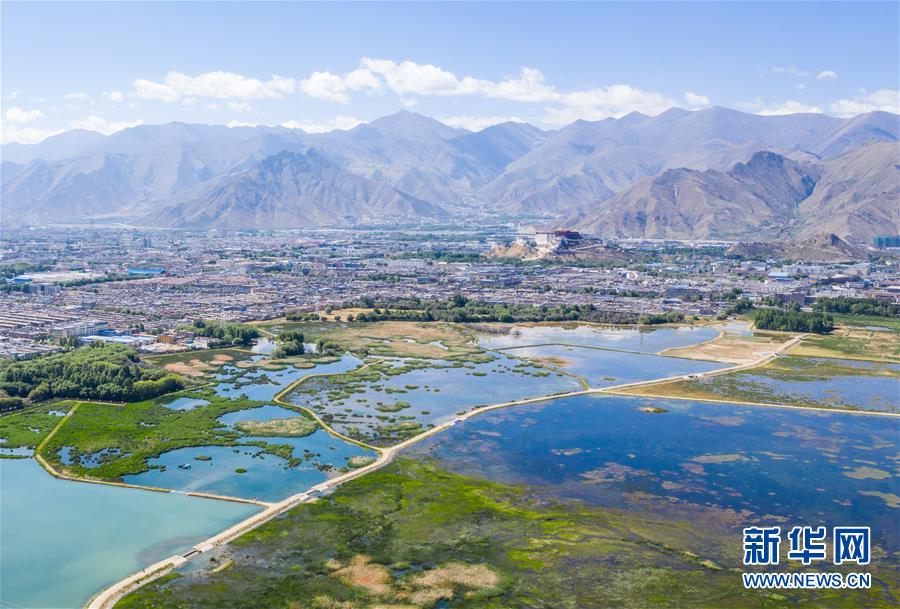 藍(lán)天白云和綠水之間的布達(dá)拉宮(6月5日攝)。新華社記者覺果攝