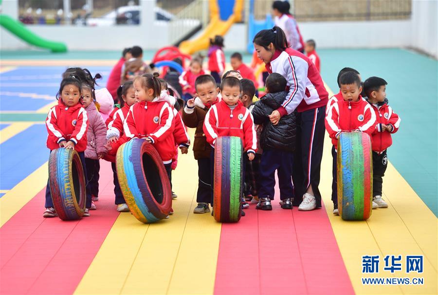 在融安縣遂融幼兒園,搬遷到縣城的孩子們?cè)趹敉馔嫠#?019年12月31日攝)。新華社記者黃孝邦攝