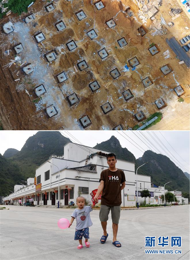 拼版照片:上圖為工人在廣西都安瑤族自治縣八仙易地扶貧搬遷安置新區(qū)項(xiàng)目施工(2016年7月25日攝);下圖為已經(jīng)建成入住的廣西都安瑤族自治縣八仙易地扶貧搬遷安置新區(qū)部分樓房(無(wú)人機(jī)照片,2019年10月16日攝)。新華社記者陸波岸攝