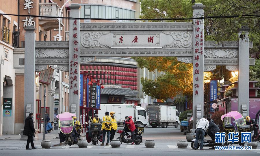 4月1日,外賣騎手在吉慶街等待接單。 新華社記者費茂華攝