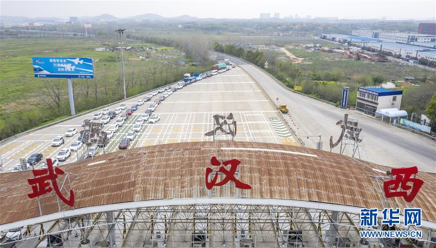3月24日,在武漢西高速收費(fèi)站交通卡點(diǎn),返漢車輛排隊(duì)等候入城(無人機(jī)照片)。新華社記者才揚(yáng)攝