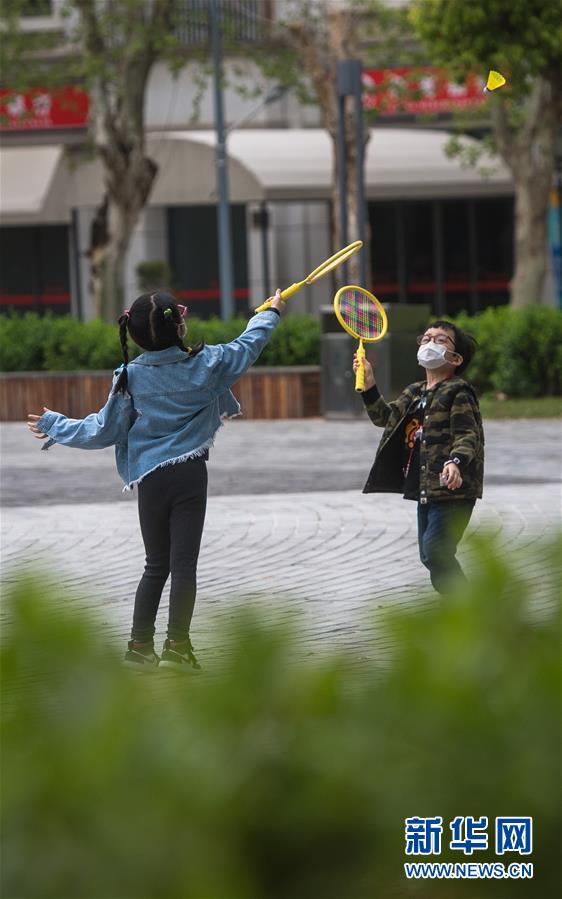 4月1日,小朋友在武漢天地廣場(chǎng)上打羽毛球。新華社記者肖藝九攝