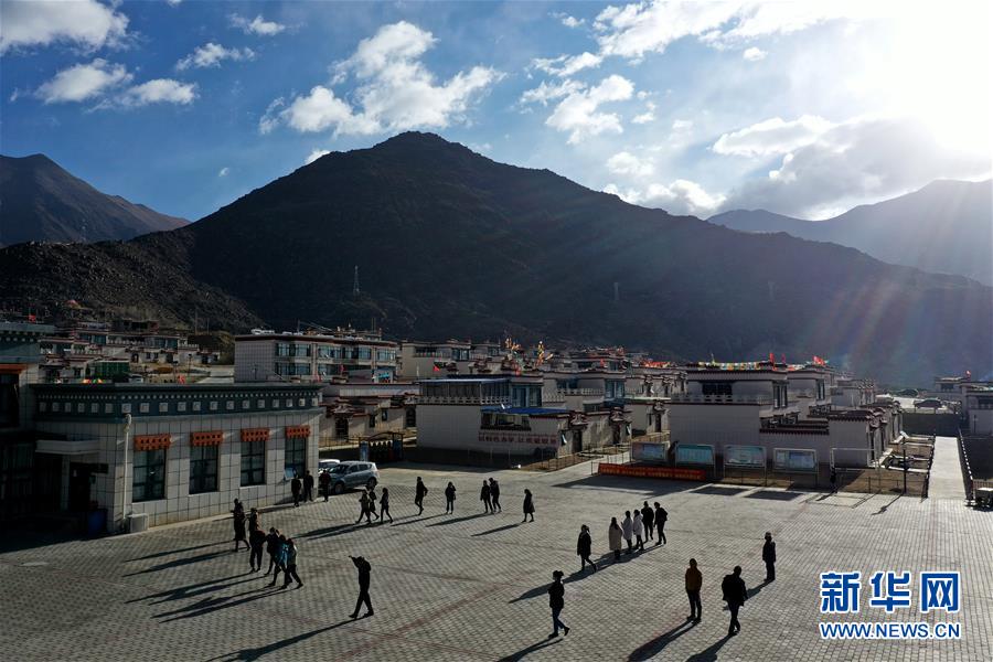 居民走在拉薩市堆龍德慶區(qū)古榮鄉(xiāng)榮瑪高海拔生態(tài)搬遷點(diǎn)廣場(chǎng)上(4月2日攝,無(wú)人機(jī)照片)。新華社記者 詹彥 攝