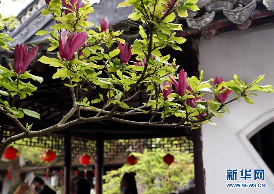 在位于上海松江的江南古典園林——醉白池,盛開的玉蘭花與粉墻黛瓦相映襯(4月6日攝)。 新華社記者 劉穎 攝