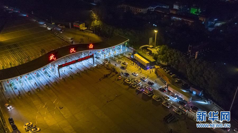 4月8日凌晨,車輛通過武漢西高速收費站(無人機拍攝)。 新華社記者 沈伯韓 攝