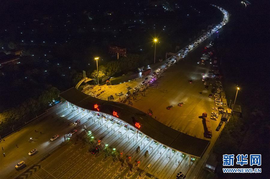 4月8日凌晨,車輛通過武漢西高速收費站(無人機照片)。 新華社記者 沈伯韓 攝