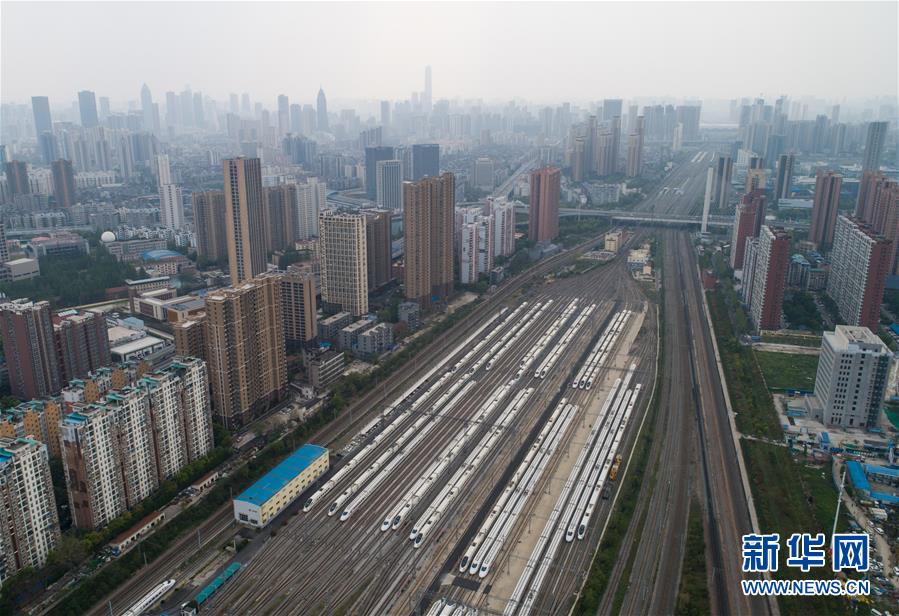 4月7日,在武漢動車段,列車??吭诖孳嚲€上(無人機照片)。 新華社記者 肖藝九 攝