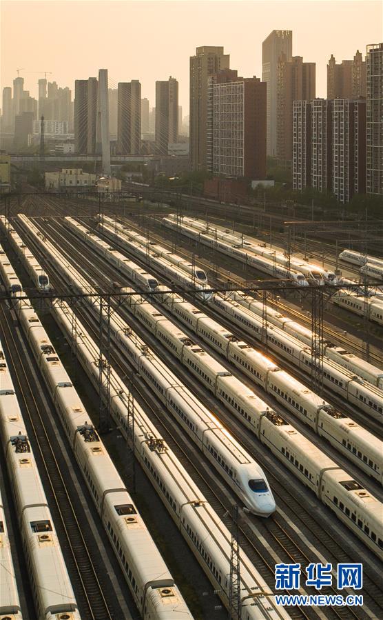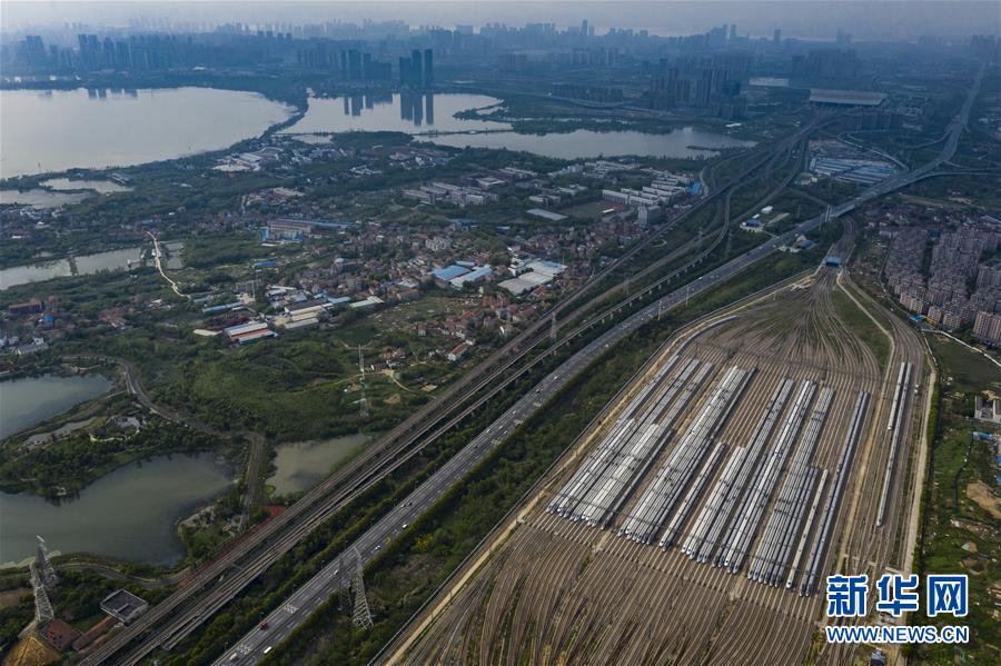4月7日,在武漢動車段,列車停靠在存車線上(無人機照片)。新華社記者 沈伯韓 攝