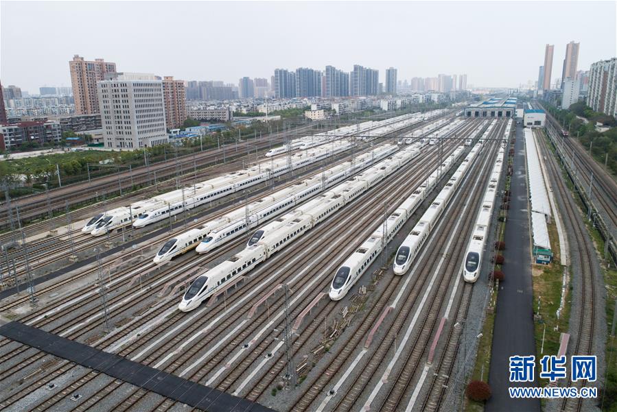 4月7日,在武漢動車段,列車停靠在存車線上(無人機照片)。 新華社記者 肖藝九 攝