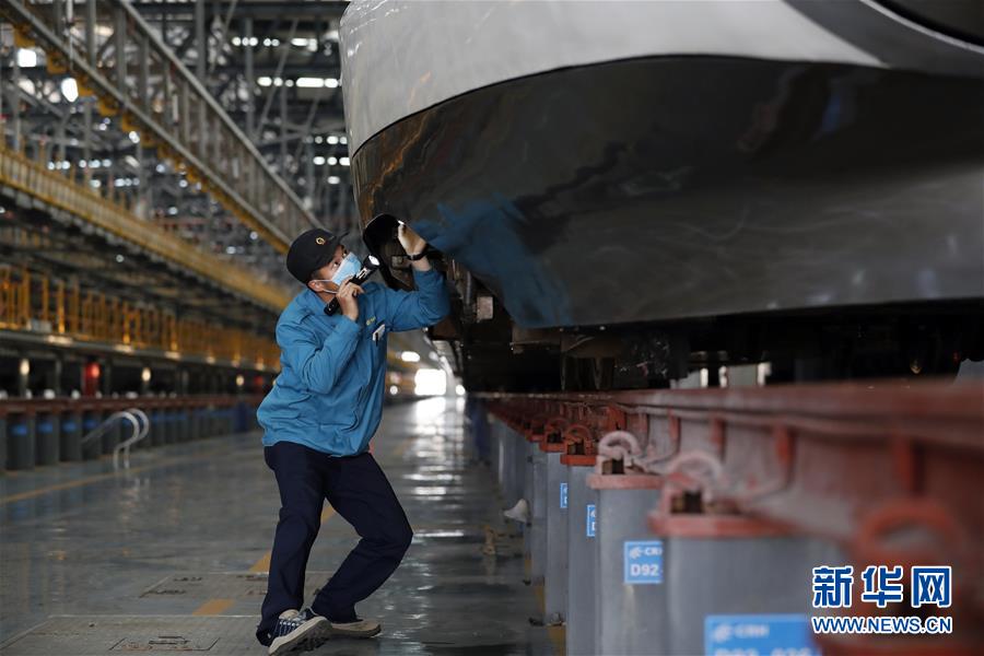 4月7日,武漢動車段運用車間綜合檢修班工長楊磊在檢查車輛情況。 新華社記者 沈伯韓 攝