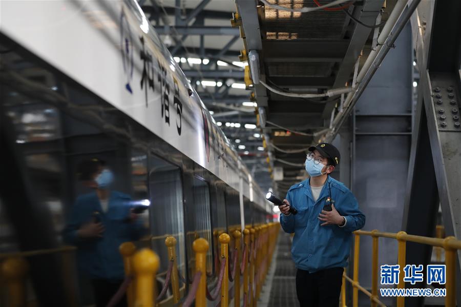 4月7日,武漢動車段運(yùn)用車間綜合檢修班工長楊磊在檢查車輛情況。 新華社記者 沈伯韓 攝