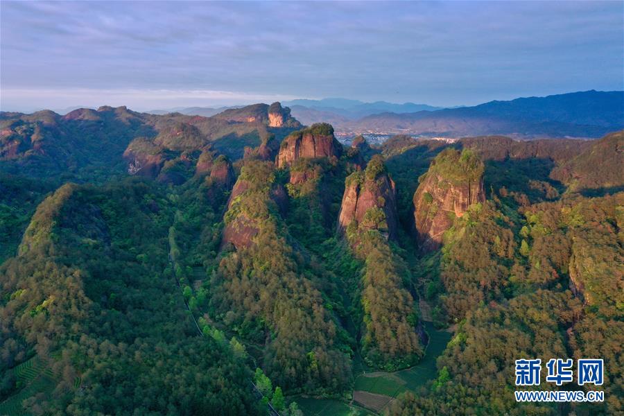 這是夕陽照射下的武夷山國家公園丹霞群巒(4月1日攝,無人機照片)。新華社記者姜克紅攝