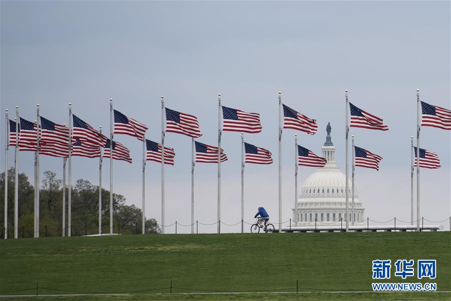4月1日,在美國首都華盛頓,一名男子從美國國旗前騎車經(jīng)過。
