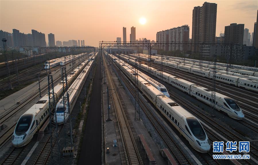 4月8日,在武漢動車段,列車停靠在存車線上準(zhǔn)備投入運(yùn)行(無人機(jī)照片)。新華社記者肖藝九攝