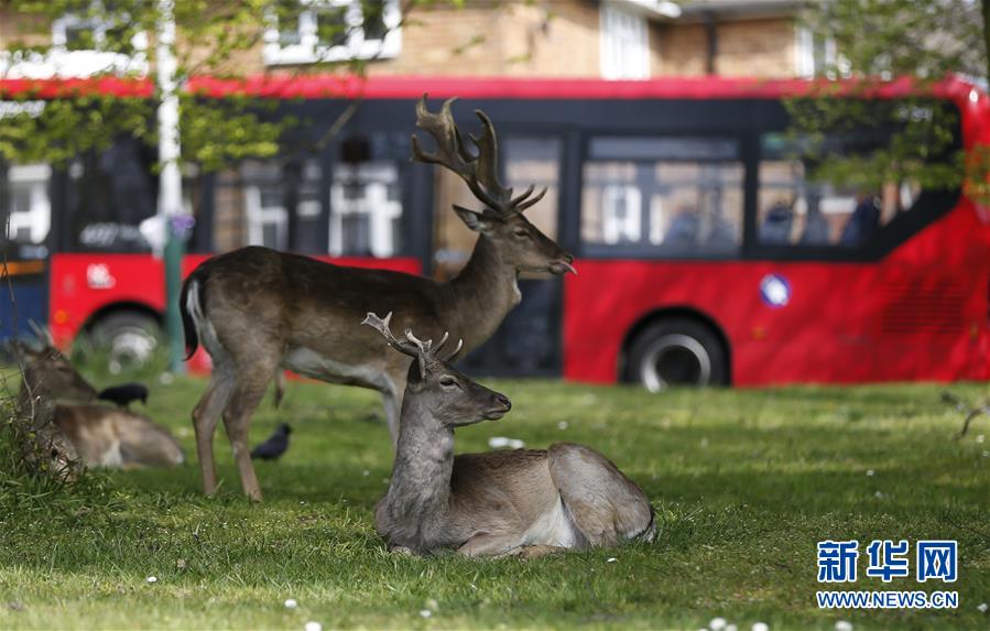 4月8日,在英國倫敦東部一個居民區(qū),附近公園里的鹿在草坪上駐足。隨著新冠疫情在英國的擴散,政府要求人們減少不必要的外出。倫敦東部一個居民區(qū)附近公園里原來散養(yǎng)的鹿紛紛從公園走出來,或吃草或接受附近居民的喂食,成為特殊時期居民區(qū)里的新“客人”。新華社記者韓巖攝