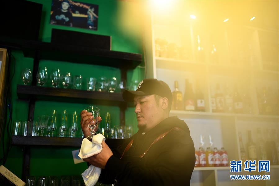 4月8日,才仁俄賽在餐廳內(nèi)調(diào)酒。新華社記者張宏祥攝