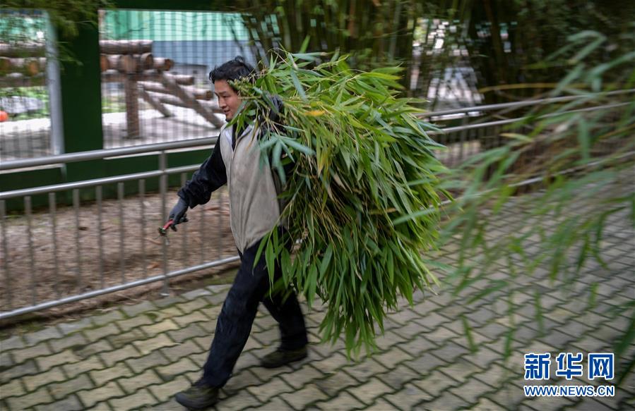 4月14日,中國大熊貓保護(hù)研究中心核桃坪基地的飼養(yǎng)員周季秋在準(zhǔn)備供大熊貓食用的竹子。新華社記者張超群攝