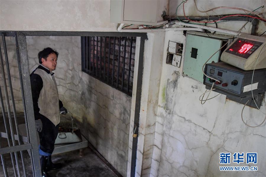 4月14日,中國大熊貓保護(hù)研究中心核桃坪基地飼養(yǎng)員周季秋在打掃完大熊貓“喜妹”的圈舍后,將大熊貓前一晚排泄的糞便稱重并記錄。新華社記者張超群攝
