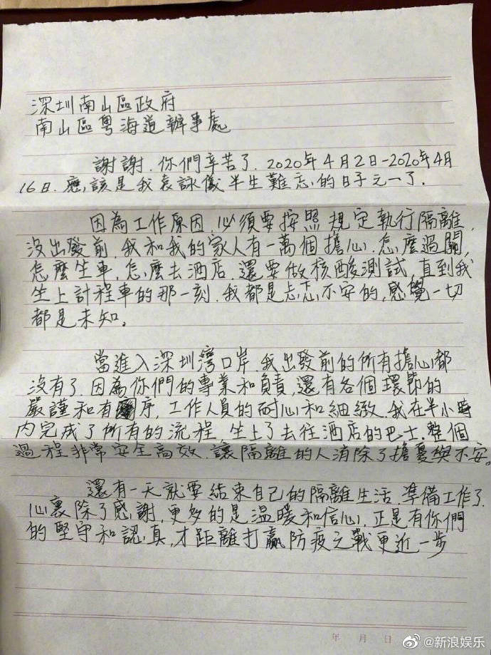她在信中說,出發(fā)前,她和家人十分擔心,不知如何過關(guān)、坐車、去酒店,但進入深圳灣口岸后,她所有的擔心都沒有了,因為有了大家的專業(yè)和負責,各個環(huán)節(jié)的嚴謹和有序,工作人員的耐心和細致,她在半小時內(nèi)就完成所有流程,坐上了去酒店的巴士。信里,袁詠儀對政府工作人員表示了感謝,“就像星星,我無法始終看見他們,但是我知道他們永遠在那里。”