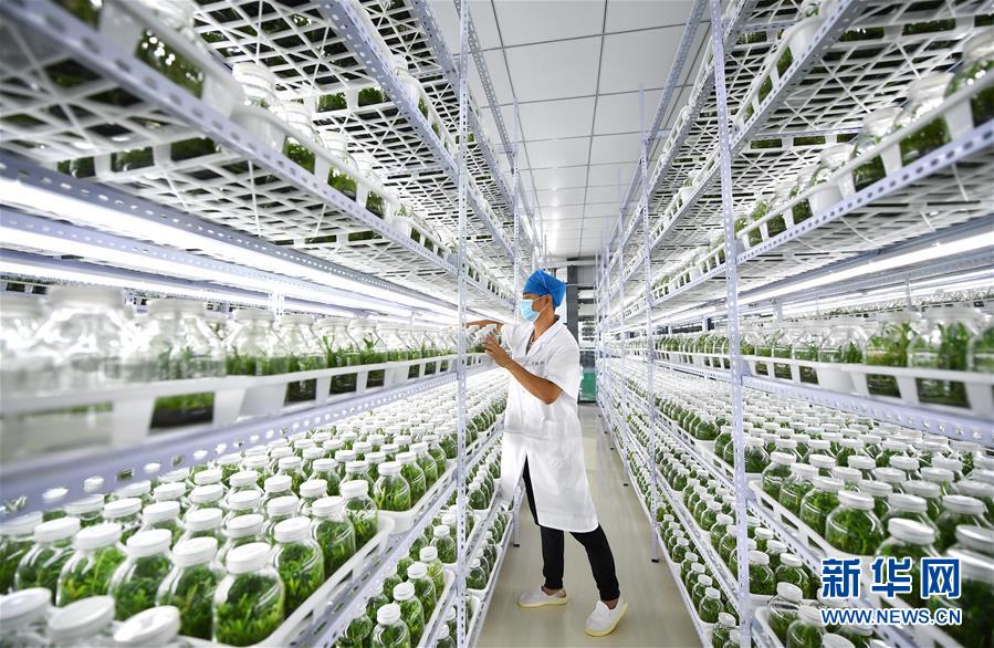 4月21日,在位于施茶村的海南勝嶸生物科技有限公司石斛育種培養(yǎng)室內(nèi),工作人員在進行石斛育種。新華社記者郭程攝