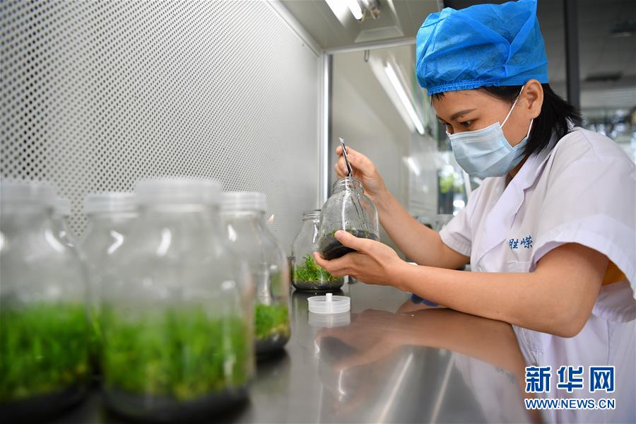 4月21日,在位于施茶村的海南勝嶸生物科技有限公司石斛育種培養(yǎng)室內(nèi),工作人員在進行石斛育種。新華社記者郭程攝