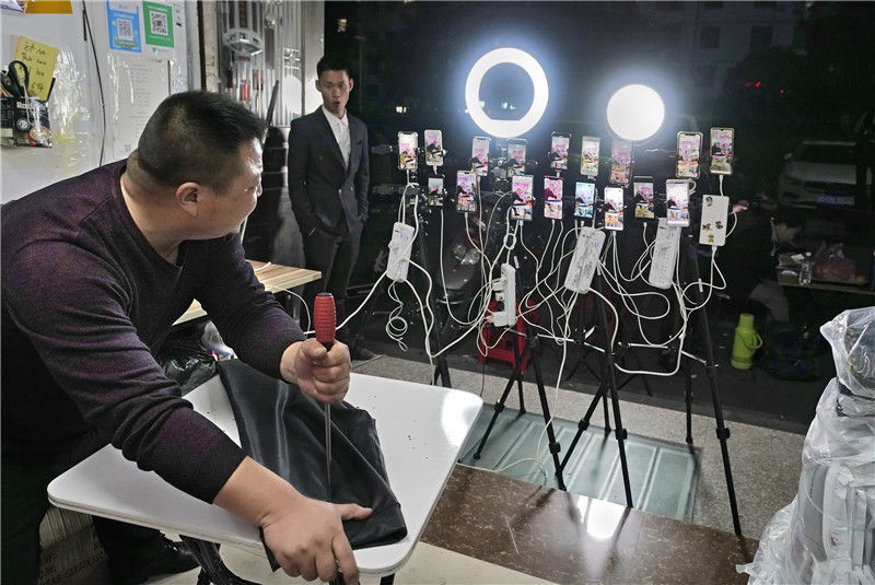 2019年11月9日,浙江金華,義烏北下朱村,一個昵稱叫“海寧大哥”的主播,正在他的小店直播銷售皮褲。4年來,他的“老鐵”(粉絲)有十萬多,還帶了好些直播弟子。