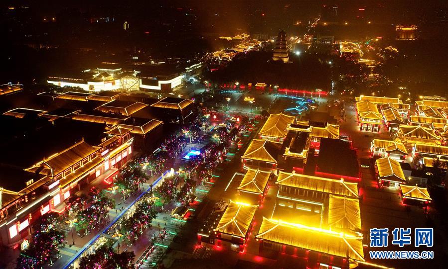 西安大唐不夜城夜景(2019年2月17日無(wú)人機(jī)照片)。 新華社記者 邵瑞 攝