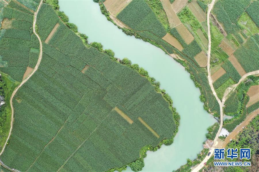 4月23日,在廣西隆安縣南圩鎮(zhèn),農(nóng)人趕著牲畜走過一座小橋(無人機(jī)照片)。新華社記者周華攝