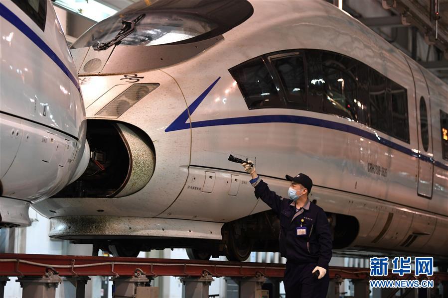 4月29日夜,合肥南動車運用所的工作人員對動車組進行檢修。每當夜深人靜的時候,合肥南動車運用所卻燈火通明,“動車安全守護者”們堅守崗位,對動車組進行全面細致檢修。新華社記者 劉軍喜 攝