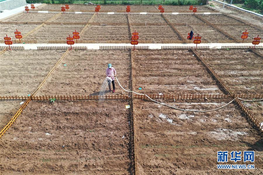 5月1日,村民在河南省鶴壁市淇濱區(qū)鉅橋鎮(zhèn)崗坡村共享菜園里澆水(無人機(jī)照片)。 新華社記者馮大鵬攝