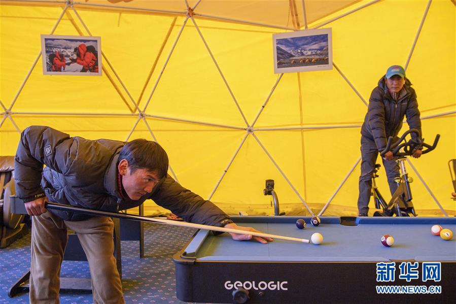 登山隊(duì)員在珠峰大本營內(nèi)打臺球(5月1日攝)。新華社記者孫非攝