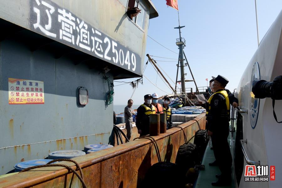 2020年5月6日,山東省榮成市石島管理區(qū)石島灣海域,榮成市漁政部門執(zhí)法人員對一運(yùn)輸船進(jìn)行檢查。