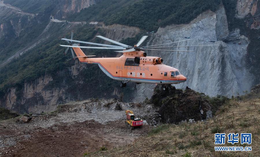 一架米-26重型直升機(jī)在布拖縣阿布洛哈村吊運挖掘機(jī)(2019年12月5日攝)。新華社記者江宏景攝