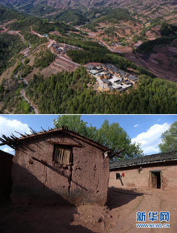 這是一張拼版照片,上圖為:昭覺縣三岔河鄉(xiāng)三河村一個易地扶貧安置點(2020年4月20日攝,無人機(jī)照片);下圖為:昭覺縣三岔河鄉(xiāng)三河村村民原來居住的土坯房(2020年4月20日攝)。新華社記者江宏景攝