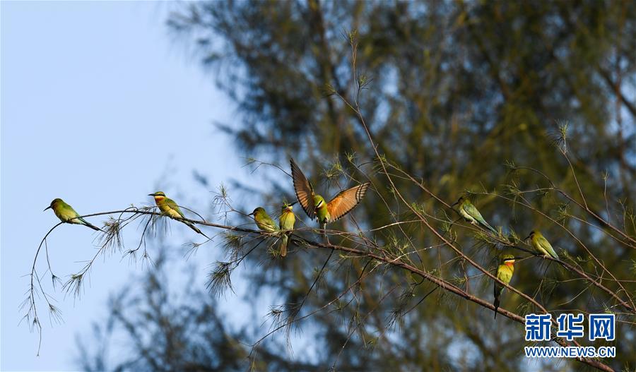在??谖逶春酉掠畏浠⒈Wo小區(qū),栗喉蜂虎在樹枝上休息(5月7日攝)。新華社記者楊冠宇攝