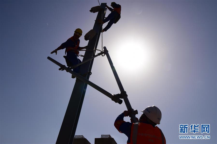 5月10日,中鐵電氣化局工程人員在鄭州新鄭機(jī)場(chǎng)至鄭州南站城際鐵路工地施工。新華社記者朱祥攝