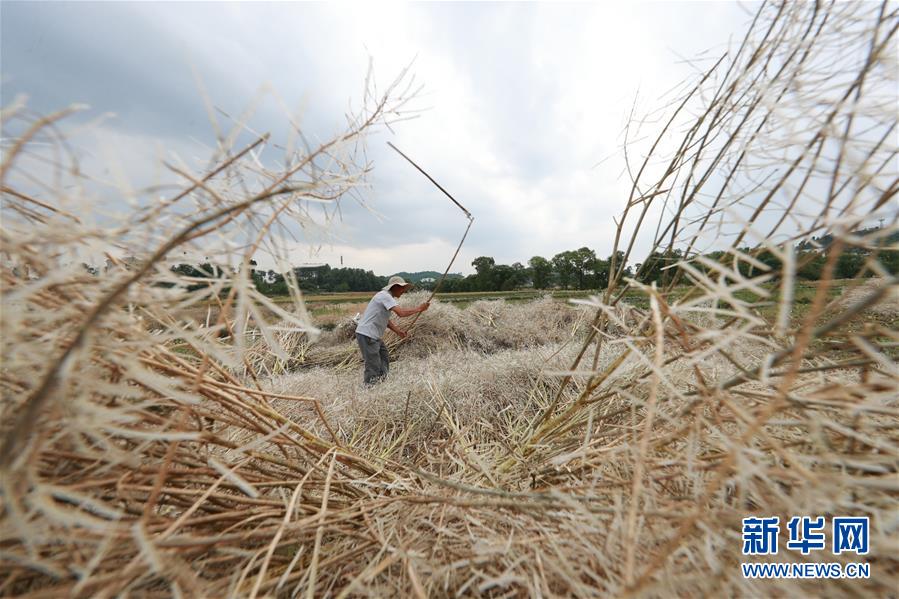 5月13日,在貴州省黔西縣洪水鎮(zhèn)解放村,村民在采收油菜籽。新華社記者楊楹攝