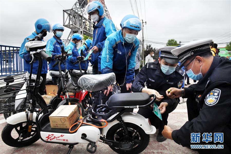 5月14日,青島市李滄交警部門民警為一外賣企業(yè)員工集中辦理電動(dòng)自行車掛牌。新華社記者李紫恒攝